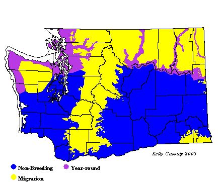 The Black Merlin is a very rare breeder in coastal forests along the outer coast of the state, the Hood Canal area, and Puget Sound. The Taiga Merlin is a very rare breeder in high-elevation forests of the north Cascades and northeastern Washington where boreal conditions exist. Prairie Merlins occur in the state, passing through in migration. Merlins are commonly found throughout western Washington, including urban areas, in winter and during migration. In eastern Washington, Merlins are uncommon in winter and during migration.