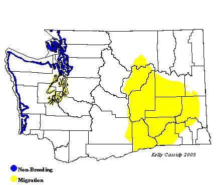 Sanderlings are common migrants and wintering birds along Washington's outer coastline. In fact, the highest densities of Sanderlings on the Pacific Coast are around the mouth of the Columbia River in southwest Washington and northwest Oregon. Birds start returning to Washington in early July, but are uncommon until mid-July. After that, they are common until the following June. The pattern is confounded by the fact that some first-year birds summer on the wintering grounds, so small numbers of Sanderlings are present on the coast year round. Summering birds are often found at Leadbetter Point. In the protected waters of Puget Sound, Sanderlings are uncommon but present, year round, sometimes as far south as Olympia. In the winter these birds are likely to be juveniles, as adults more commonly winter on the outer coast. In eastern Washington, Sanderlings are a rare but regular migrant. They are more common there during fall migration than spring.