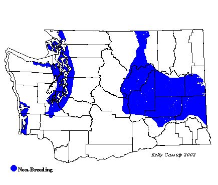 The Snowy Owl is an irregular winter visitor to Washington, with sightings most likely from early November to mid-March. Abundance varies from year to year, with none reported some winters, over 100 reported in others, and at least a few most years. Snowy Owls are most frequently seen in Whatcom County, but other coastal areas in Skagit, Grays Harbor, and Pacific Counties also host birds. In irruptions, which seem to occur at least every 10 years, many owls can be found in coastal habitats in these locations, with smaller numbers showing up anywhere in the state. In eastern Washington, single birds are sighted near the Potholes Reservoir and in dry wheatlands in northern Lincoln County most years.